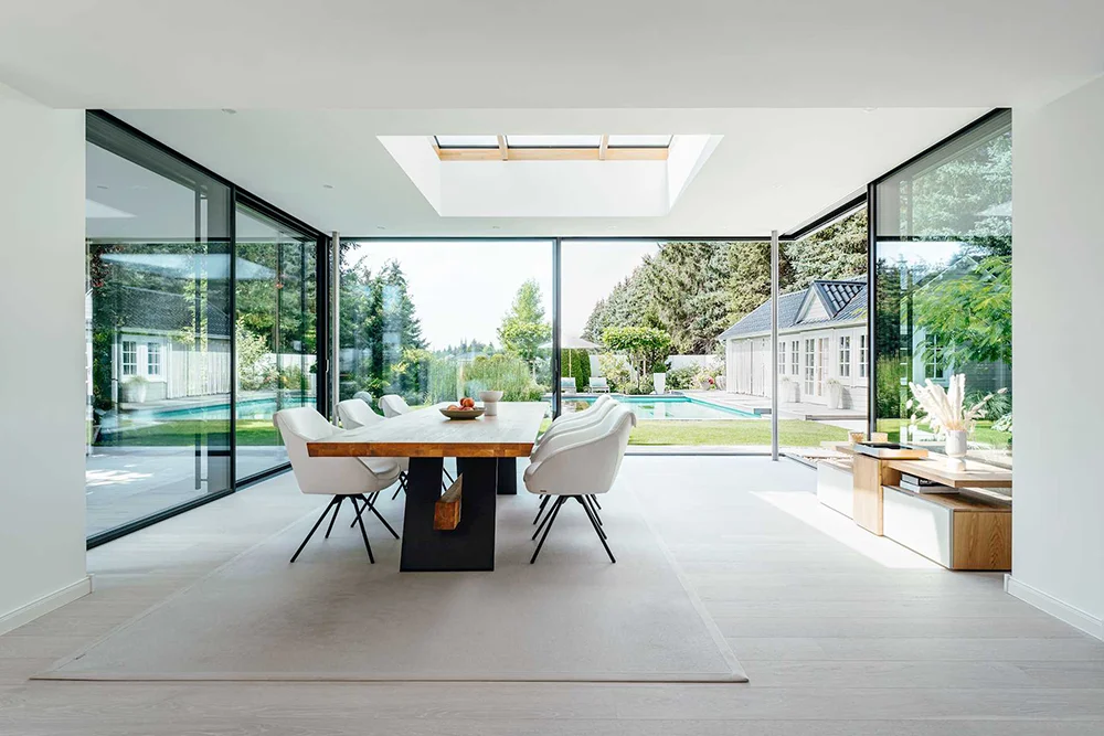 Das bedeutet für Sie: Im Sommer bleibt die Hitze draußen, im Winter bleibt die Wärme drin und das ganz ohne Klimageräte oder Zugluft. Zusätzlich ermöglichen Glasfaltwände oder Schiebesysteme eine größtmögliche Öffnung zum Garten und sorgen für fließende Übergänge zwischen Innen und Außen. Je nach Wunsch lassen sich Teilbereiche vollständig öffnen oder flexibel segmentieren. Die Verglasungen sind langlebig, pflegeleicht und erfüllen alle sicherheitstechnischen Anforderungen inklusive ESG/TVG-Optionen.